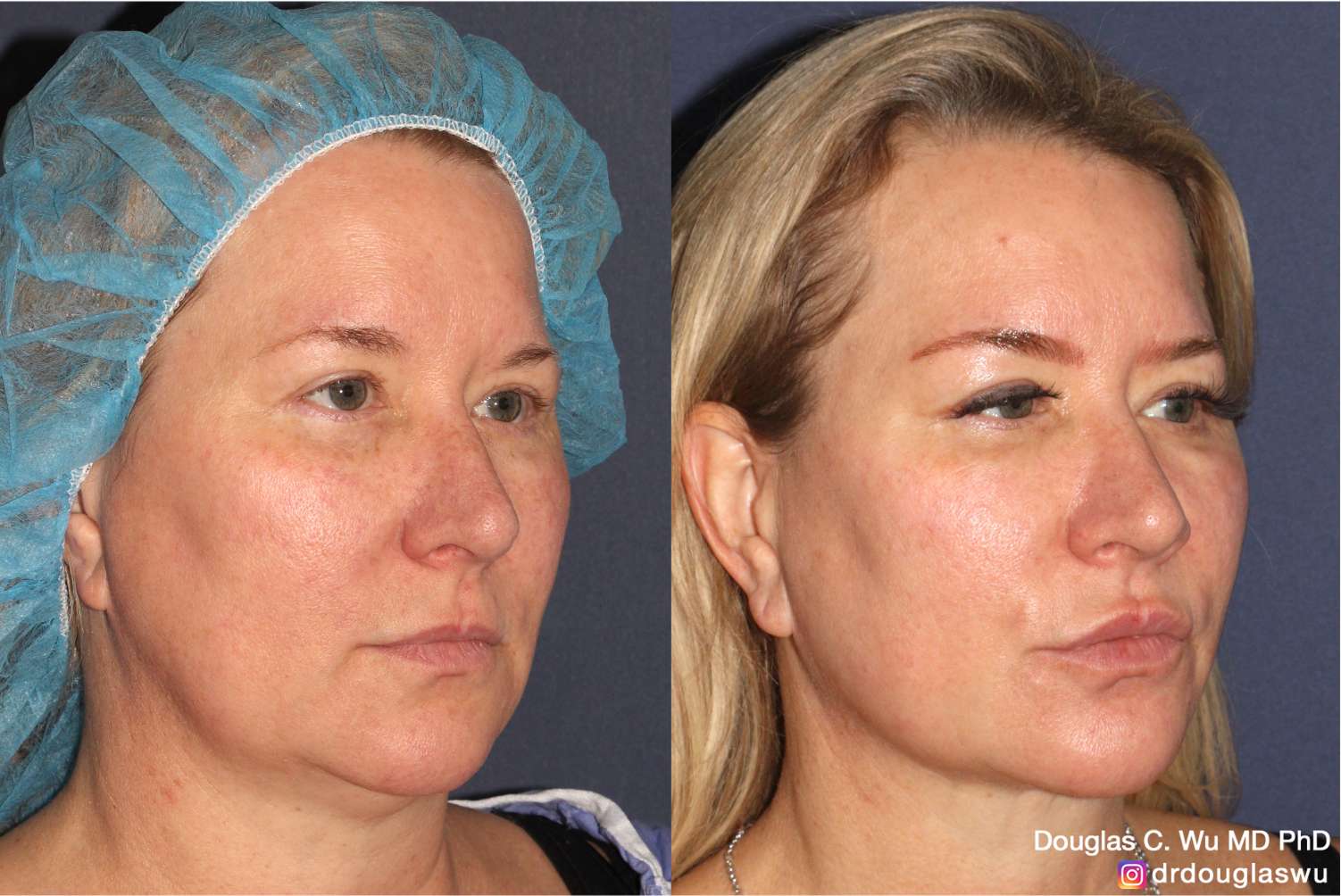 This patient had facial sculpting with a combination of hyaluronic acid fillers and biostimulatory injectable treatment.  Her skin was treated with a combination of fractional lasers, radiofrequency microneedling, and medical grade skin care. This patient had facial sculpting with a combination of hyaluronic acid fillers and biostimulatory injectable treatment. Her skin was treated with a combination of fractional lasers, radiofrequency microneedling, and medical grade skin care.